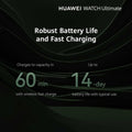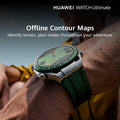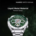 Introducing the HUAWEI Watch Ultimate Green: crafted with zirconium-based Liquid Metal, it's corrosion-resistant and built for tough environments. Built for performance and durability. This durable watch offers advanced materials, golf mode, offline maps, 100m water resistance, health tracking, and a two-week battery, making it ideal for outdoor and fitness enthusiasts.