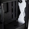 The interior comes entirely in black, with a PSU shroud that only adds to the sleek and unobtrusive look. Behind the shroud is where users will find space for a pair of 3.5" HDDs in the HDD cage provided. Alternatively, 2.5" SSDs can be installed here, or next to the motherboard. The motherboard tray and PSU shroud both offer numerous openings for optimum cable management, with up to 24mm cable management space. Underneath the case is a removable dust filter suitable for a full sized ATX PSU.