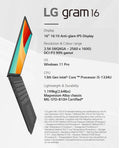 LG gram offers not only various ports but also two Thunderbolt™ 4 for ultimate scalability. Experience 5k display at a 40 GB transfer speed while charging external devices simultaneously. Intel Core i5-1334U (12MB Cache), 16GB LPDDR5-SDRAM, 256GB SSD, 40.6 cm (16") WQXGA 2560 x 1600 IPS, Intel Iris Xe Graphics, WLAN, Webcam, Windows 11 Pro
