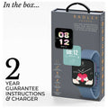 Our smart watches are presented in a gift box complete with instruction manual, USB and a 2-year guarantee. Download the free Radley London App to enjoy additional functionality. iOS 12+ and Android 8.0+ compatible.