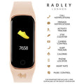 Introducing the Radley London Series 8 smart activity tracker with colour touch screen and up to 7-day battery life. Watch features include heart rate monitor, GPS function, 6 different dial choices, receive call and message notifications, track specific activities(running/walking/cycling/climbing) in real time, distance/steps/calorie tracking, live weather updates from your watch, selfie camera control, find your phone function, track your sleep, alarm and reminders.