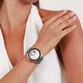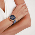 This watch is designed with a round rose gold plated case and comes with interchangeable verdigris green genuine leather and denim blue silicone straps.