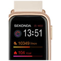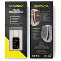 The Track Smart Watch has a rectangular rose gold plastic case housing a 1.47 TFT display, fastened with a quick release pink silicone strap. Features include steps/ distance/ calorie counter, monitor your sleep, heart rate, blood oxygen and access 8 sports modes. With even more features including 17 language options, an alarm feature and notification updates, be Smart with your time.