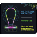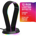 LED Light Up Headset Stand lets you display your Gaming Headset safely and neatly in one place. USB powered with 2 USB ports for charging and powering your other devices. Full RGB lighting with 12 different colour modes.