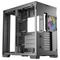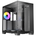 The Antec C8 ARGB Full Tower case features a panoramic 270° view through seamless glass panels, designed for showcasing high-end components. It supports extensive cooling options, including multiple 360mm radiators and up to 10 fans. The case includes pre-installed ARGB fans, offers dual-chamber design for efficient cooling, and has ample space for E-ATX motherboards and large GPUs.