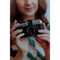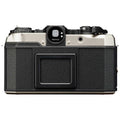 Half-frame to yield double the photos, with manual film winding and rewinding, and a fixed-focus 25mm lens.
